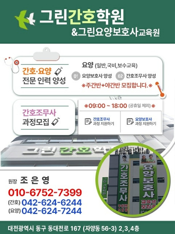 안녕하세요 저희 그린간호학원/그린요양보호사교육원은 대전지역에서 '최다' 졸업생을 배출해 한 자리에서 오랜경력으로 운영하고있는 학원입니다.